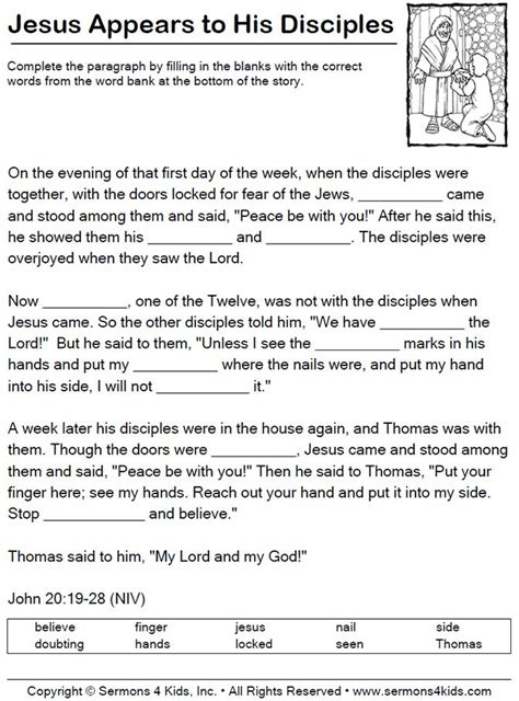In the Bible, we learn about the time when Jesus appeared to His disciples after His resurrection. The Bible states that the disciples had gathered together and were hiding in fear of the Jews. Suddenly, Jesus appeared to them and spoke to them. This momentous event is one of the most important moments in the Bible, and it marks the beginning of Jesus’ ministry. This worksheet will help you explore the Bible passage and its meaning.