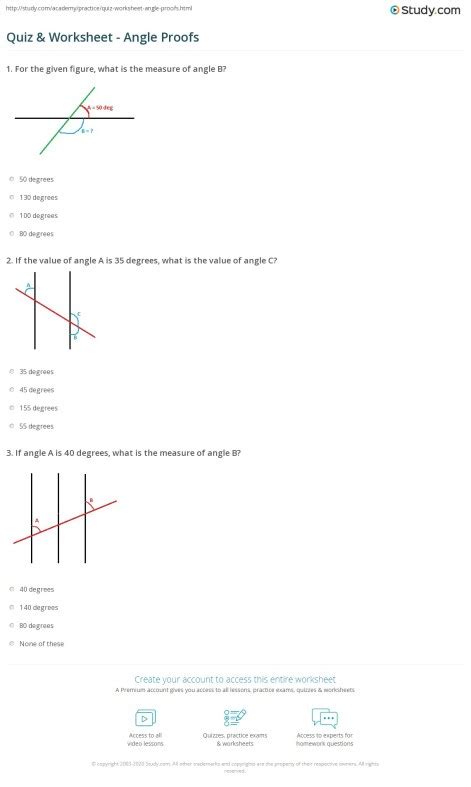 Once the Angle Proof Worksheet 1 answer key has been found, it is important for students to understand how to use it. The answer key provides the answers to each of the questions, but it is up to the student to understand how to apply the principles that they have learned. Additionally, students should pay attention to the diagrams and explanations that accompany the answer key, as these can help to ensure that they have a full understanding of the worksheet.